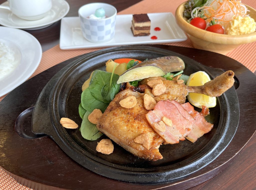 ◎洋食「若鶏のガーリックステーキ 秋茄子と厚切りベーコン添え」(1,980円税込)