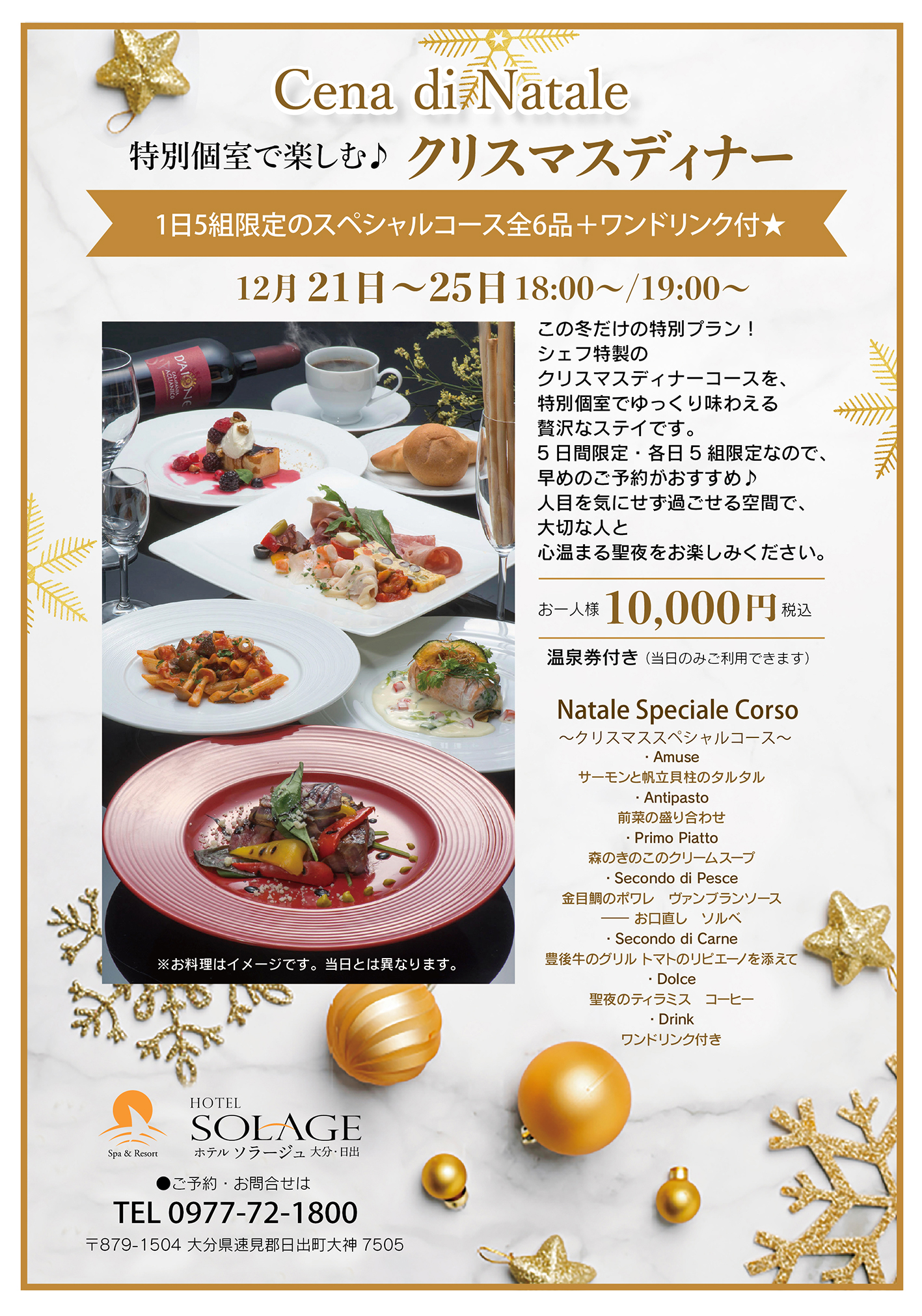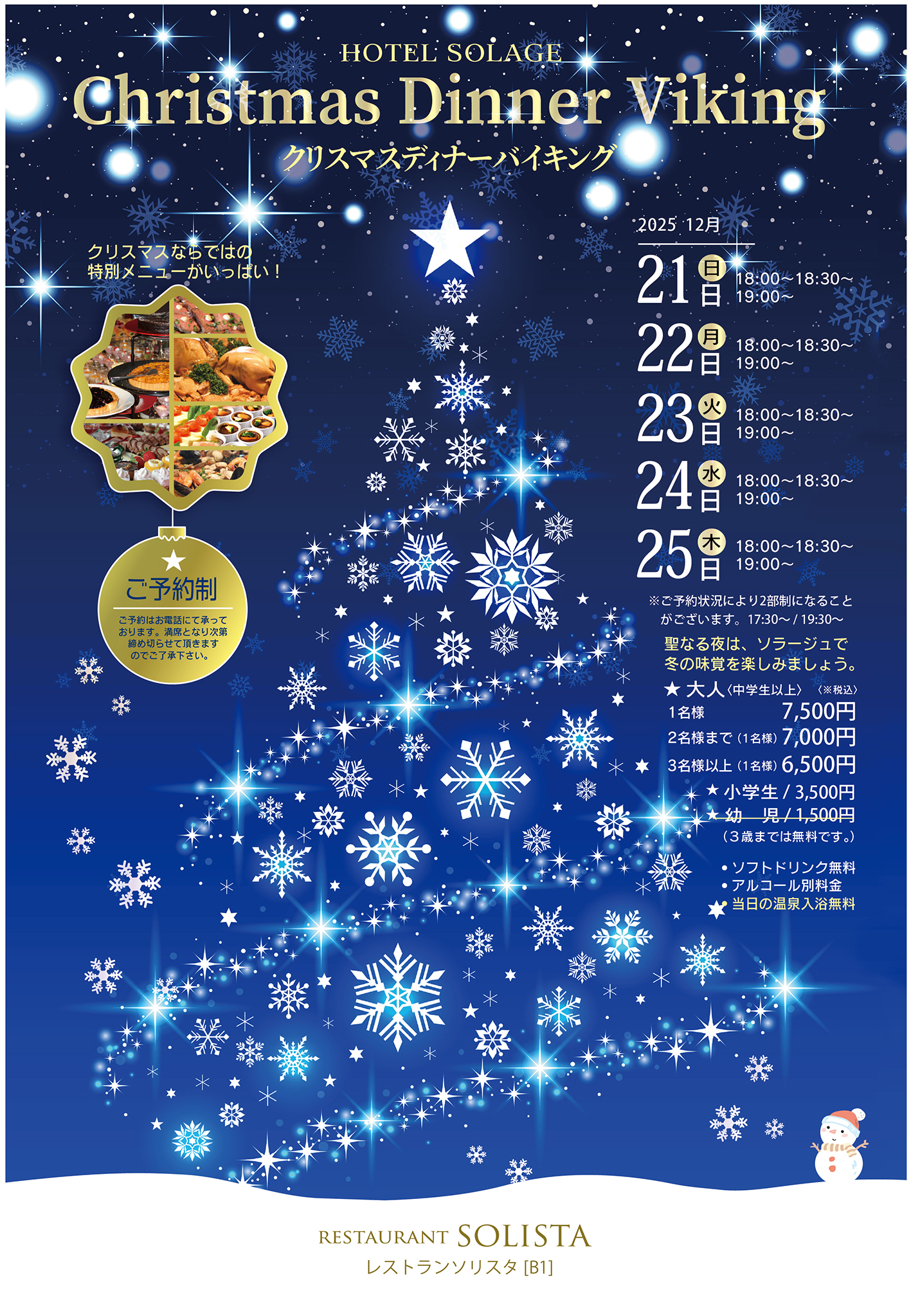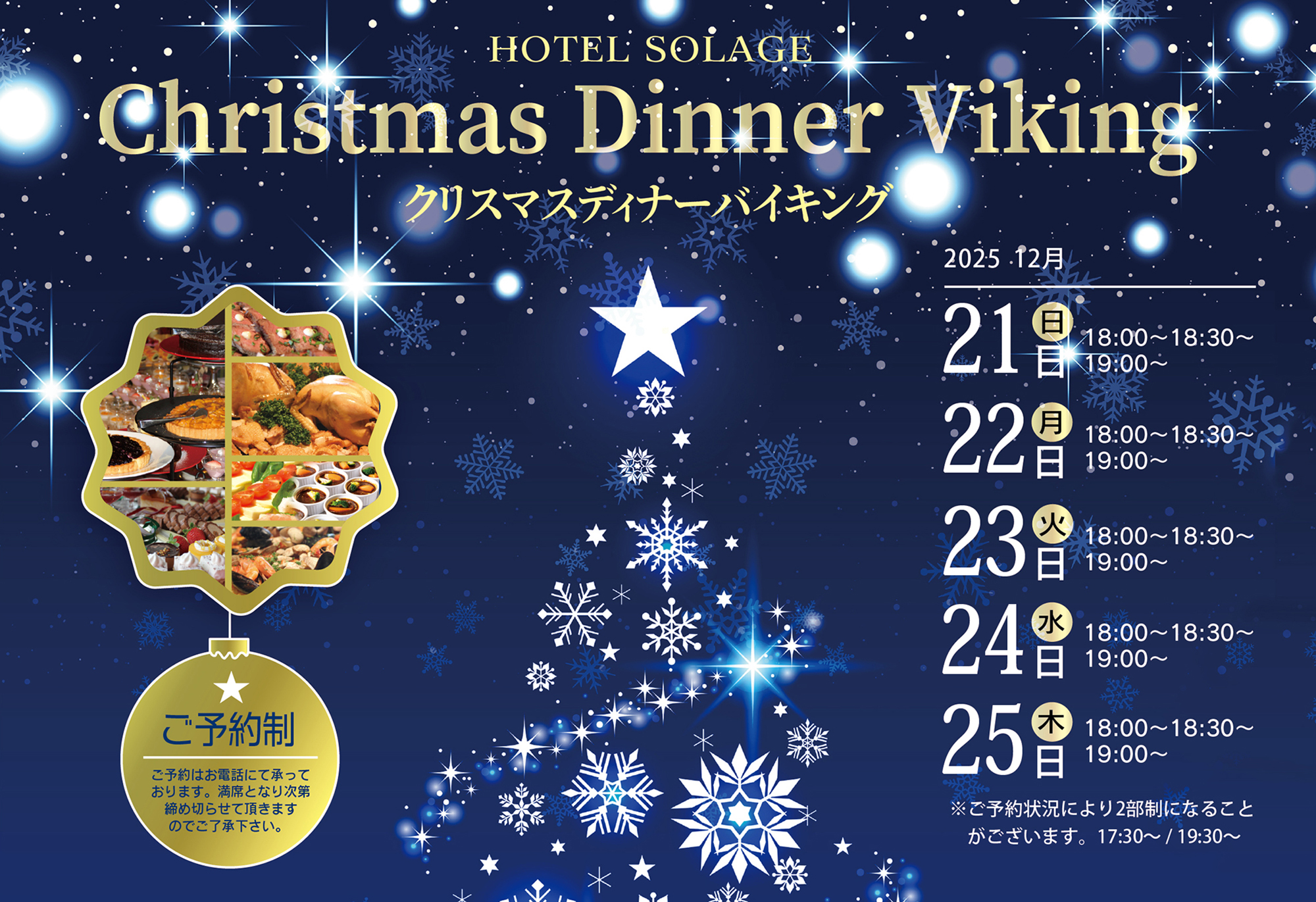 🎄クリスマスの夜はホテルソラージュで🎄 お好きなお料理を選べるバイキング⭐️・・・ゆったりと個室でコース料理⭐️聖なる夜にはどちらも体験したい・・・ちょっとお洒落で美味しいクリスマスをご提供いたします。 🎄ご家族やお友達とディナーバイキング🎄