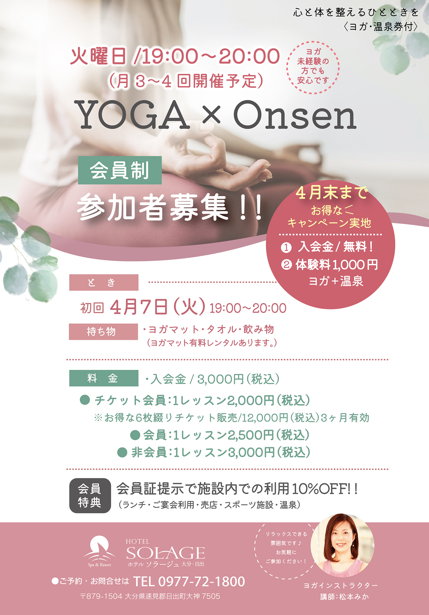 ✨初心者の方も大歓迎✨ ゆっくり流れる空気を感じながら 日常から少し離れて、自分を大切にする”ご褒美時間”を過ごしませんか? 男性の方もぜひご参加お待ちしています! 4月のYOGA✖️LUNCH✖️ONSEN・・4月5日/9:45集合〜10:00〜 ※火曜日の夜のみ、会員制でお得な、特典いっぱいの新プランのご案内🎵 先ずは、初回4月7日(火)19:00〜の体験レッスン(1,000円)のご参加がおすすめで〜す!
